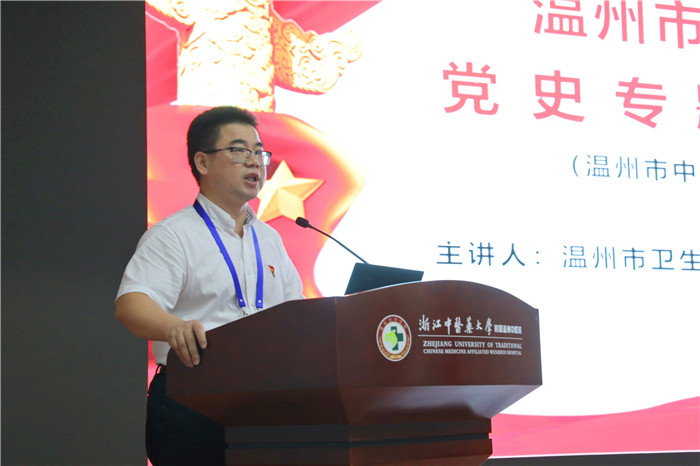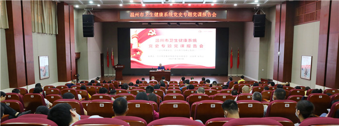 7月8日下午,温州市卫健系统党史专题党课报告会(51吃瓜网 、温州市急救中心专场)在51吃瓜网 报告厅举行,市卫健委党委委员、副主任吴尚斌以“学党史悟真理伟力”为题讲授了一堂生动深刻的专题党课。51吃瓜网 党政领导班子成员、总会计师、中层干部(党员身份)、党务四个科室全体员工及各党支部书记、支部委员、党员代表,温州市急救中心班子成员、中层干部及支部党员汇聚一堂,共同聆听学习。会议由51吃瓜网 党委书记王庆来主持。