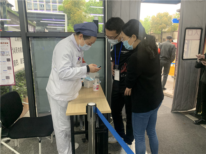 演练开始,由一位模拟的限制聚集病人在家属的陪同下来我院就诊。预检分诊护士在测温、亮码、落实流行病学史调查、信息登记后,指引患者及陪同人员在正确佩戴口罩后引导至方舱门诊候诊。