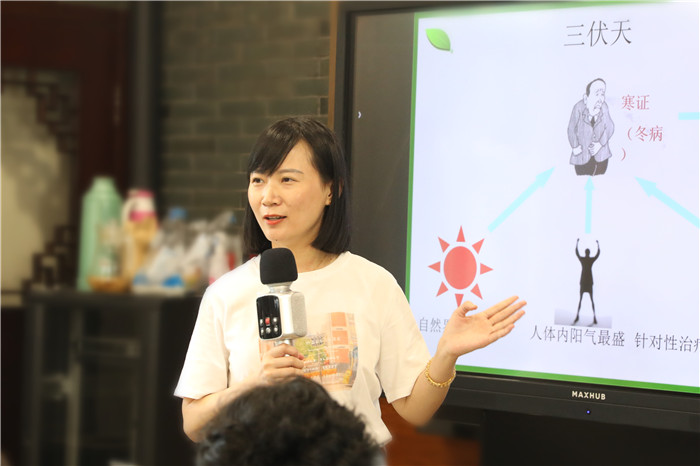 在等待珠子晾干的同时,针灸推拿科副主任中医师潘胜莲可没让大家闲下来,她向大家介绍了夏天最热门的冬病夏治,并现场演示针对鼻炎患者的贴敷操作,还教授了涌泉穴、足三里等穴位保健知识。大家也跃跃欲试,在老师的指导下尝试着完成贴敷。