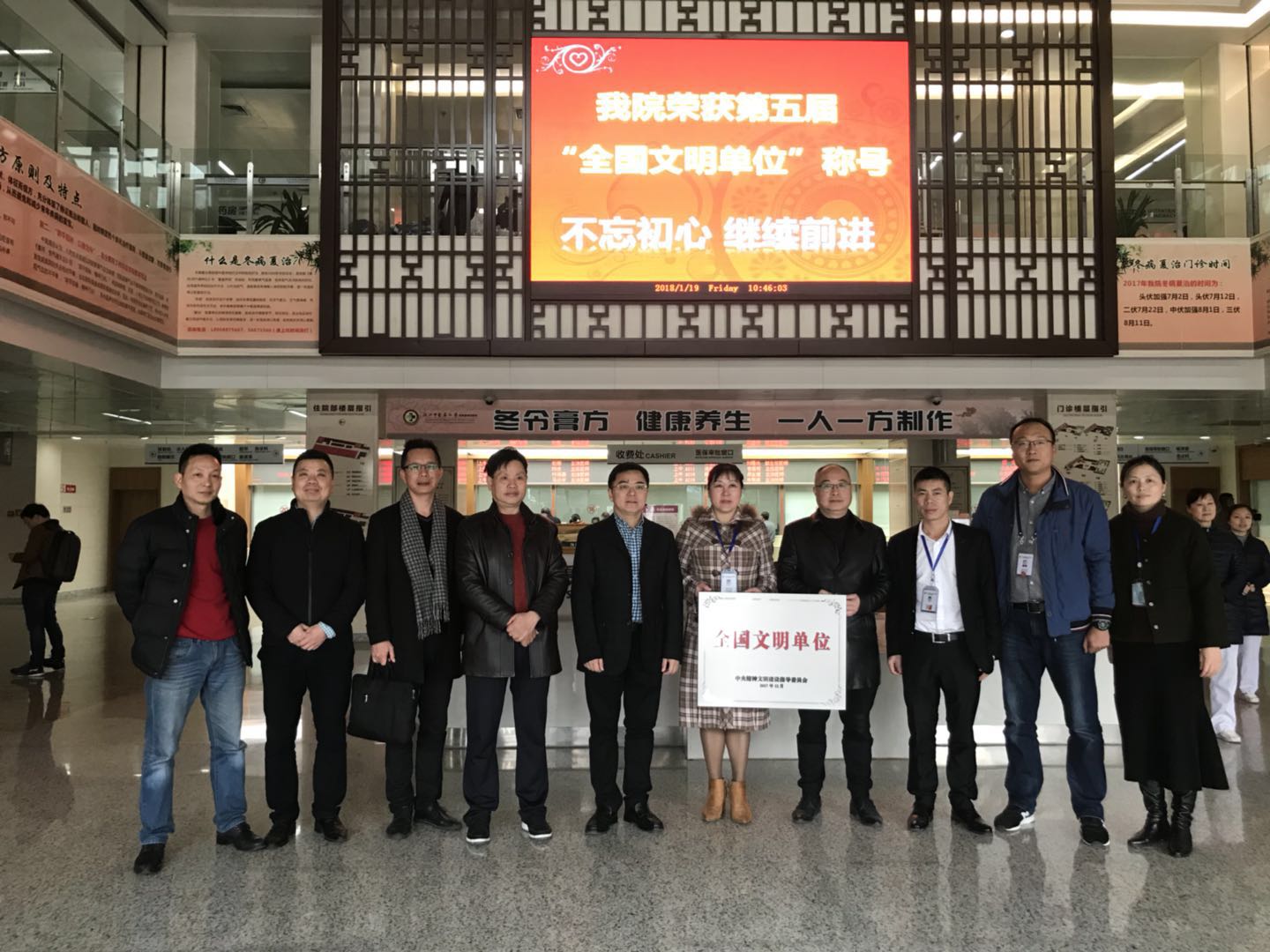 1月19日上午,温州市委宣传部副部长、市文明办主任吕朝晖、副主任丁柏强、处长翁曙明一行专程送“全国文明单位”荣誉牌、证书到51吃瓜网 六虹桥院区。党委副书记黄爱林代表医院接过“全国文明单位”奖牌,副院长麻瑞龙、朱文宗、赵永强、缪心军及相关职能部门共同见证了这一历史时刻。这是医院获得的又一项国家级殊荣,在全市卫生系统尚属首家。