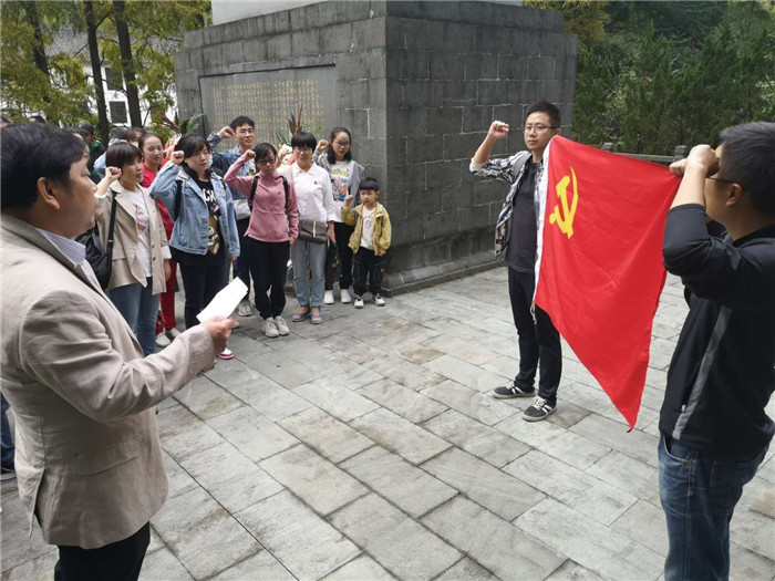 纪念碑前,在鲜红的党旗下,支部书记夏平易带领大家重温入党誓词,现场一片神圣庄严。
